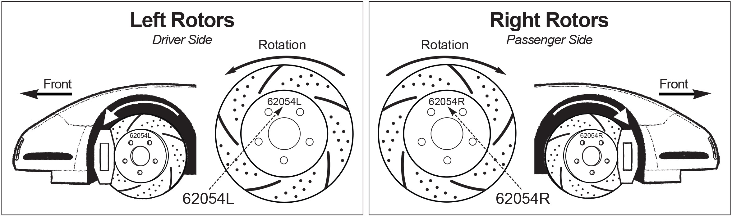 Brake Performance Rotors are machined with a directional pattern. Each Rotors is marked with the part number followed by an "L" or "R" on the outer face of the hat. The "L" indicates driver side and the "R" indicates the passenger side